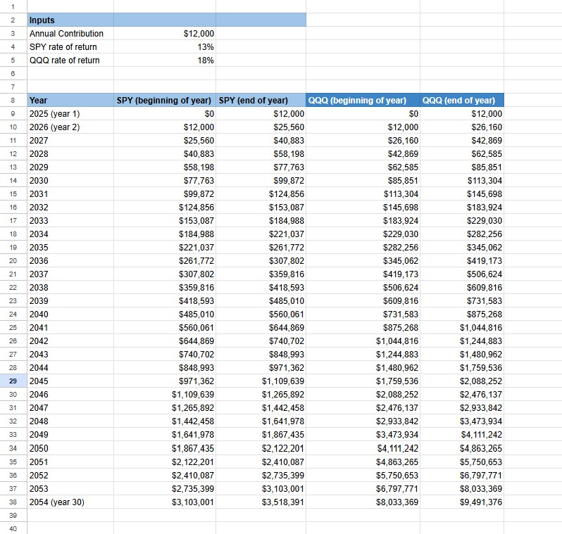 If one were to follow this strategy, what would be the end result? Assuming a $12k annual investment (i.e. $1000 per month) for a typical career length of 30 years, depending how one allocates the portfolio across SPY & QQQ, the end result will likely land somewhere between $3.5 million and $9.5 million (see the below spreadsheet) – not bad for a simple/boring strategy! So what did my first-born choose? Let’s just say she didn’t disappoint (at least for now), I’m looking forward to seeing how her approach evolves over the coming years😊